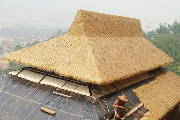 5.當(dāng)屋面茅草鋪放完后,從距離立柱上端0.8~1.2m處鋸斷。